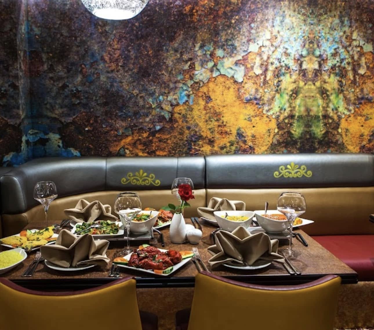 The rich textures of the wallpaper perfectly complement the warm lighting and vibrant dishes served, creating an intimate dining experience that feels both exotic and cosy.