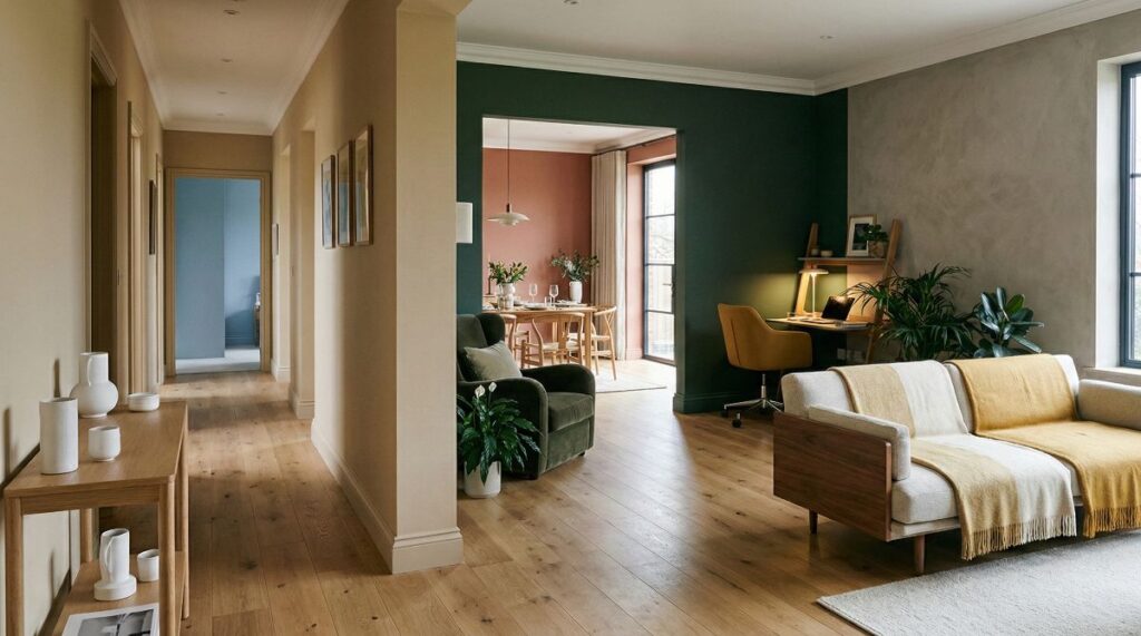 White remains a symbol of purity and endless possibility, allowing for any arrangement of accessories. However, a stark “hospital” white can feel harsh. Beiges, by contrast, introduce warmth and a homely atmosphere, remaining the safest and most timeless choice for those who value classic British elegance. When matching wall paint with wood flooring, these neutral canvases allow the natural grain of the timber to take centre stage.